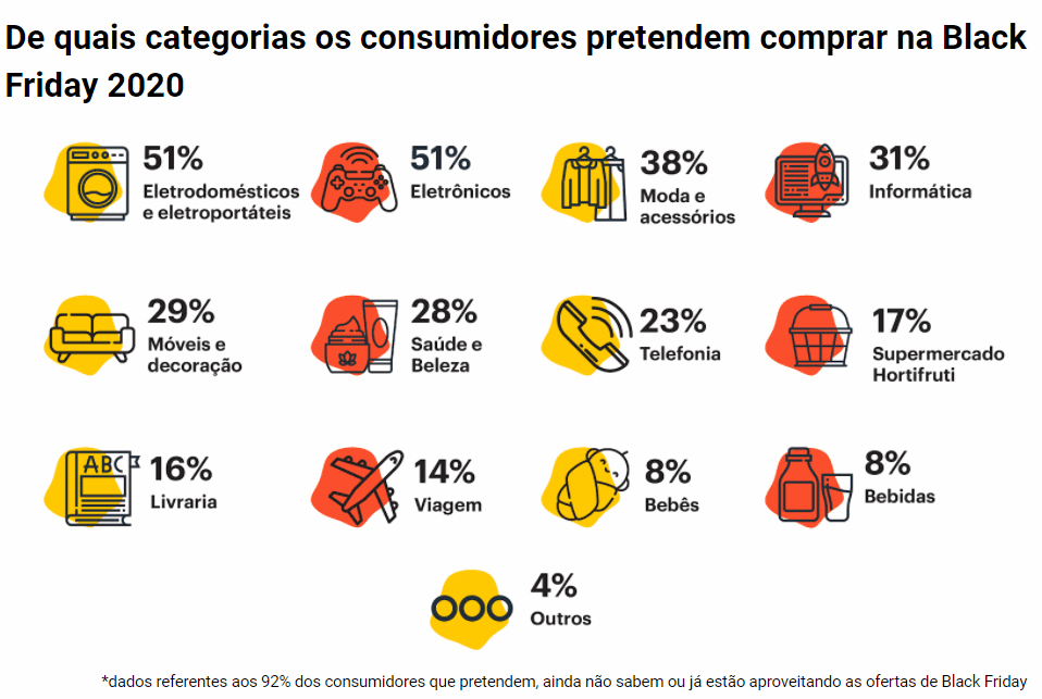 Ainda de acordo com a pesquisa, 18% dos consumidores estão indecisos e 11% já estão aproveitando os descontos. O estudo indica ainda que, entre os 92% que vão consumir ou ainda estão em dúvida, as categorias mais procuradas devem ser eletrônicos, eletrodomésticos e eletroportáteis (confira os detalhes no infográfico abaixo).
