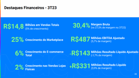 Dos R$ 15 bilhões de faturamento da empresa no 3º trimestre de 2023, impressionantes R$ 11 bilhões foram nos canais digitais, representando 73% das vendas. Destaque para o crescimento de 25% do marketplace, que foi responsável por R$ 4 bi. A empresa também valorizou os resultados positivos dos esforços implementados desde o início de 2023 na melhoria da margem bruta.