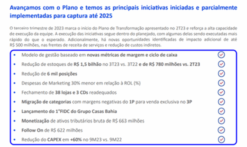 O Grupo Casas Bahia (antiga Via) está focado no seu plano de reestruturação apresentado ao mercado em 2º trimestre de 2023, composto pela chamada de aumento de capital, implantação de medidas de proteção do caixa, fechamento de lojas e negócios deficitários, redução de estoque e uma ampla redução de despesas incluindo redução do budget de marketing e corte em pessoal. A margem bruta sofreu um forte recuo de 30,7% para 23% nesse trimestre, explicado pelo “recuo das vendas líquidas e outros fatores não recorrentes, principalmente a relevante redução de estoques mais antigos”.