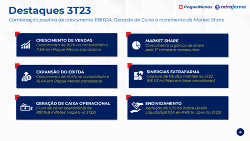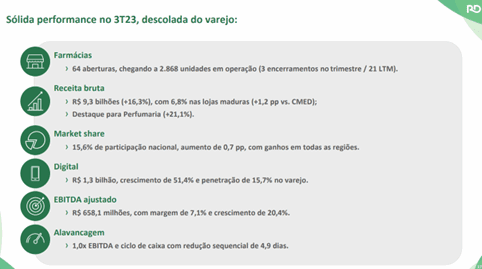 A empresa apresentou importante evolução em vendas de 16,1% no período, puxada pela expansão de lojas da bandeira Pague Menos, que representou 5 pontos percentuais dos 11,5% de crescimento dessa bandeira. O digital também é destaque no grupo, atingindo penetração de 12,1%, frente aos 9,5% no 2º trimestre de 2023.