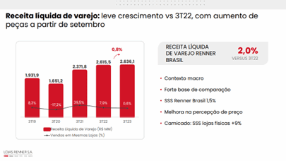 As vendas do 3º trimestre de 2023 aumentaram apenas 0,8%, na comparação com 2022, e refletem o momento desafiador que o segmento passa com o aperto no orçamento familiar dos brasileiros, como destacado pela companhia: “Durante o 3º trimestre de 2023, observou-se um cenário de consumo ainda desafiador, especialmente em agosto. Esse impacto seguiu mais pronunciado nas lojas de perfil popular, que estão expostas a consumidores com poder de compra e situação de crédito mais pressionados no contexto atual. Contudo, em setembro, houve evolução das vendas, com crescimento do número de transações e de peças, tendência que se manteve em outubro”.