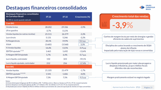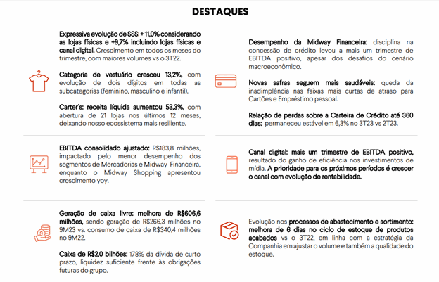 Observamos que o terceiro trimestre de 2023 apresentou um ambiente de negócios bastante desafiador para o varejo, com um consumidor ainda bastante pressionado pelo aumento de custos, limitando a sua renda disponível para consumo, com endividamento alto (porém em queda) e ainda pouco confiante no momento atual (mas bastante confiante para o futuro).