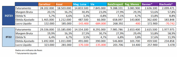 As empresas da amostra apresentaram vendas estáveis ou com baixo crescimento, se comparadas com 2022, refletindo os desafios atuais do varejo, bem como a pressão das novas variáveis que estão sendo apresentadas, como o forte crescimento das plataformas asiáticas operando no Brasil.