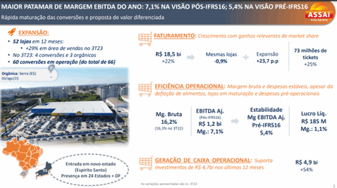 O Assaí também sentiu a pressão da deflação de alimentos, como destacado no seu relatório: “Deflação de commodities afeta vendas mesmas lojas (-0,9%) com progressão de volumes ao longo do trimestre”. Entretanto, a empresa manteve seu forte ritmo de crescimento de vendas com a manutenção do seu programa de expansão, como reforçado no mesmo report com a seguinte menção “expansão avança com 7 inaugurações no 3º trimestre de 2023, totalizando 52 novas lojas em 12 meses, com crescimento total da área de vendas de 29%: e cerca de 20 lojas em fase de obras ao final do 3º trimestre de 2023, a serem inauguradas no 4º trimestre de 2023 e em 2024”.
