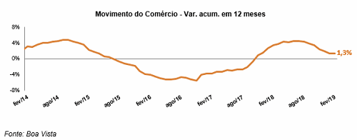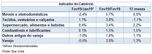 O Indicador Movimento do Comércio, que acompanha o desempenho das vendas no varejo em todo o Brasil, caiu 0,5% em fevereiro na comparação mensal dessazonalizada, de acordo com dados apurados pela Boa Vista. Na avaliação acumulada em 12 meses, o indicador subiu 1,3%. Já na variação contra fevereiro do ano anterior o varejo cresceu 3,8%.