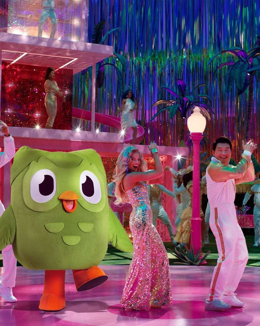 No início do mês, a mascote também esteve presente na estreia do filme em Los Angeles, vestido de Barbie e desfilando pelo tapete rosa. Além disso, um anúncio do app inspirado no filme será exibido nos cinemas dos Estados Unidos nas próximas semanas. Toda essa ação visa destacar a participação da Duolingo no filme, onde é possível ouvir os sons de notificação das lições da plataforma em uma das cenas.