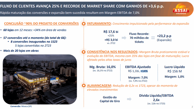 Assai: Faturamento com crescimento impulsionado pela performance da expansão. A margem brutaficou praticamente estável, com evolução do Ebitda, mesmo com 35% das lojas em fase de maturação. O lucro foi afetado pelas altas taxas de juros e pela redução de 0,2x na alavancagem, em relação ao 1º trimestre de 2023, apesar do momento de elevados investimentos.