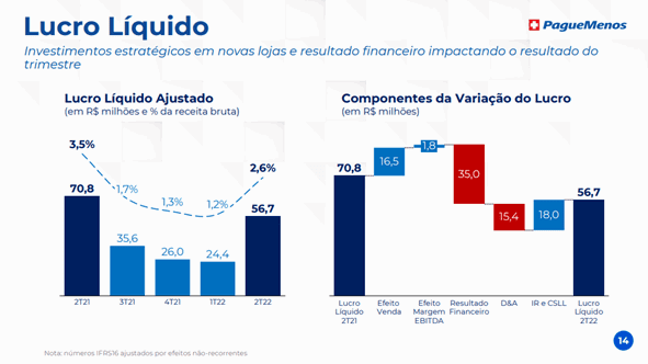 Pague Menos: O resultado líquido ajustado do 2º trimestre de 2023 foi de R$ 10 milhões negativos, em decorrência principalmente do crescimento das despesas financeiras e da Extrafarma, ainda em processo de turnaround. O lucro operacional consolidado antes do imposto de renda foi de R$ 141,3 milhões, crescimento de 7,6% em relação ao mesmo período do ano anterior. No 2º trimestre de 2023 foi iniciado um ciclo de desalavancagem financeira, que irá contribuir gradualmente para a redução do resultado financeiro, permitindo assim a retomada da expansão de lucros.