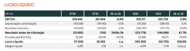 Riachuelo: A companhia encerrou o 2º trimestre de 2023 com um prejuízo líquido de R$ 17,6 milhões, ante um lucro líquido de R$ 26,4 milhões no 2º trimestre de 2022, principalmente em função da redução de 8,8% do Ebitda na comparação anual; pelas maiores despesas financeiras, em função do aumento da taxa de juros; e das maiores despesas, com Imposto de Renda e contribuição social, já que a Riachuelo não constituiu IRPJ e CSLL diferidos sobre prejuízo fiscal no 2º trimestre de 2023. Além disso, houve o aumento na alíquota de imposto da Midway Mall decorrente da mudança de tributação de lucro presumido para lucro real.