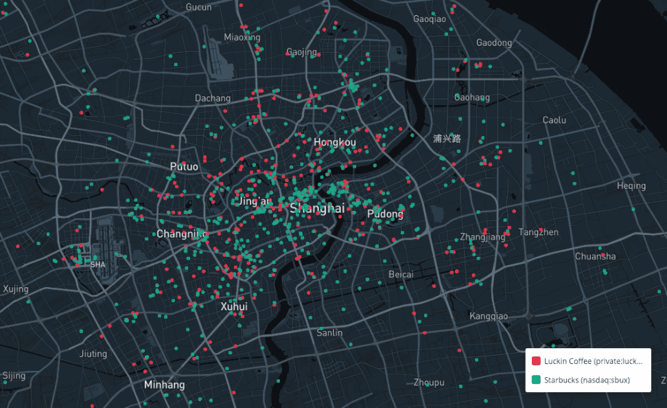 A forte aceleração da empresa é evidencia pelo mapa abaixo das localizações da Starbucks versus Luckin Coffee em Shanghai.