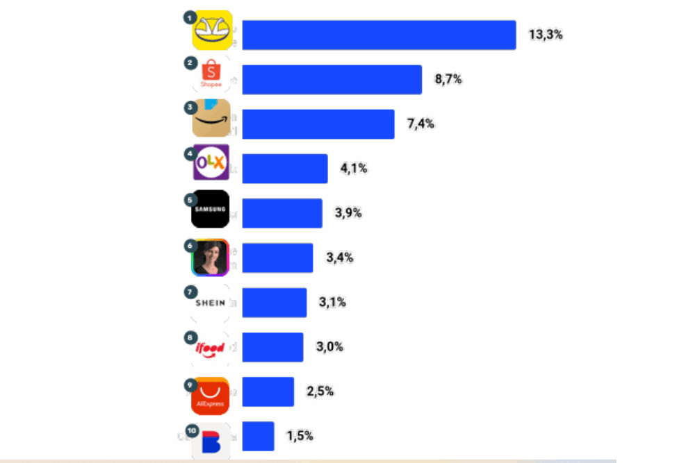 Outro destaque do relatório é o iFood, que foi responsável pela maior movimentação no ranking, ultrapassando o AliExpress e alcançando a oitava posição, com 3% do share. Esse foi o quarto mês consecutivo de crescimento da empresa brasileira, líder em delivery na América Latina.