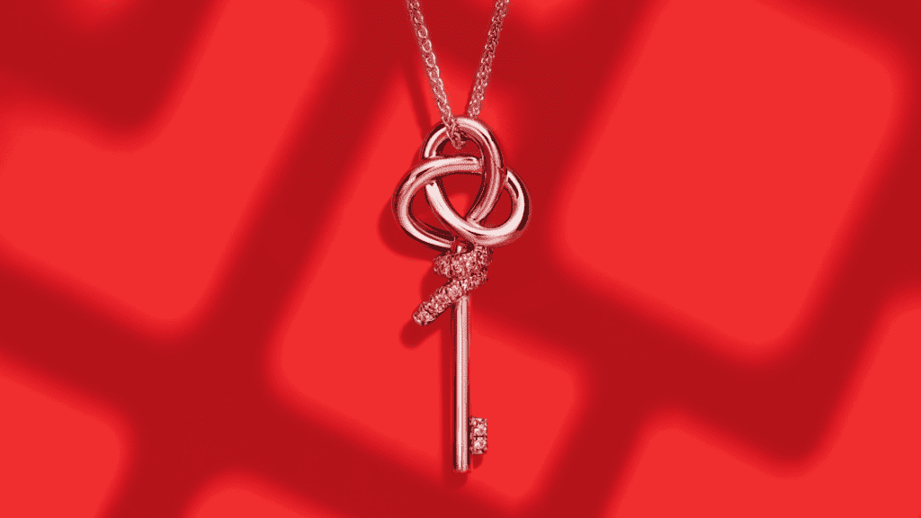 Para marcar a estreia online no Luxury Pavilion, a joalheria lançou um pingente de ouro, de edição limitada, em forma de chave, decorado com safiras rosa.
