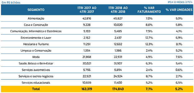 A pesquisa da ABF revelou que em 2018 o total de unidades do setor cresceu 5,2%, com um saldo de 7.570 novas operações, totalizando 153.704 unidades de franquias ativas no país. Esse ritmo foi mais do que o dobro da variação registrada entre 2016 e 2017. O desenvolvimento de novos formatos e modelos de negócios, a expansão para fora das grandes capitais e a maior disponibilidade de pontos comerciais a um custo mais competitivo foram os principais fatores que alavancaram essa expansão.