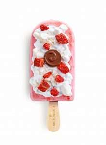 - Pavlova: picolé de fragola com cobertura de chantilly, suspiros, morangos e moeda de chocolate.