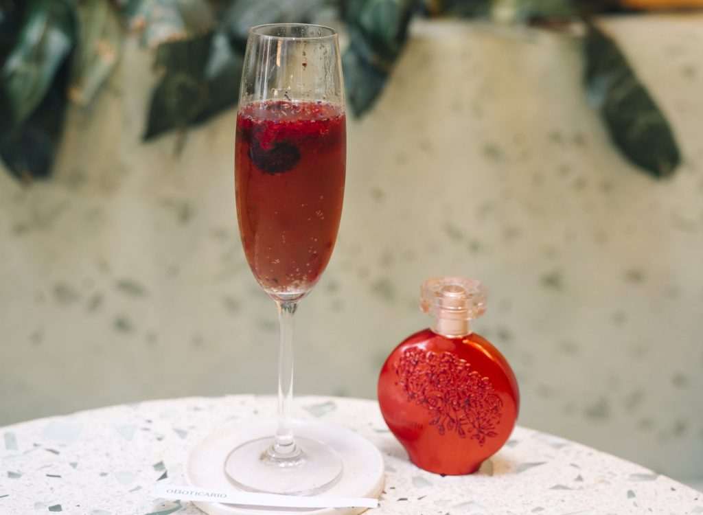 - Floratta Red: Red: A fragrância Floratta Red serviu como inspiração para esta bebida alcoólica e vegana, que traz espumante, licor de cassis e pedaços de frutas vermelhas congeladas em sua composição.