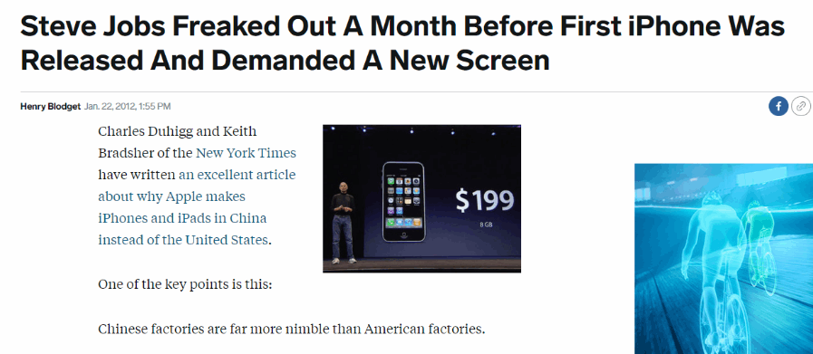 Para sua surpresa, ao chegar na cidade chinesa, uma nova fábrica já estava sendo construída para atender a demanda da Apple, com engenheiros recrutados e disponíveis 24/7 e com toda a matéria prima necessária para iniciar o desenvolvimento do produto. Detalhe: tudo isso antes mesmo de ganhar qualquer contrato com a Apple.
