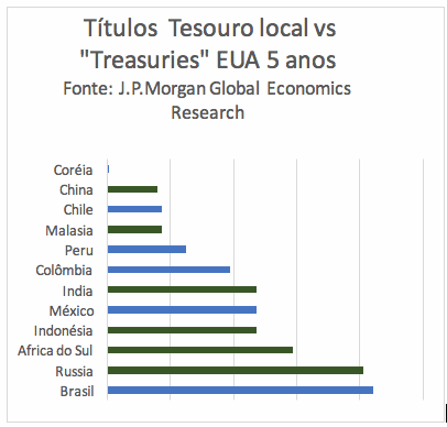 De volta aos dados econômicos, o gráfico abaixo mostra que o Brasil é o campeão mundial em diferença de juros entre seus títulos soberanos e os títulos do tesouro americano.