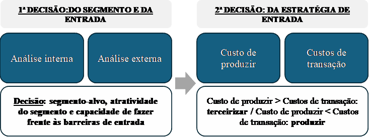 Identificada a oportunidade, é necessário escolher a melhor estratégia de entrada, que pode ser baseada em uma análise de viabilidade econômica, considerando as análises de custos e projeções financeiras, além da importância e posição do novo segmento dentro da empresa e da necessidade de controle e dos custos intrínsecos de transação.