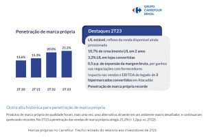 A pressão em custos de alimentos fomentou também uma mudança de comportamento de consumo dentro do próprio segmento, as famílias passaram a buscar formatos mais orientados a valor, como o Atacarejo, trocaram de bandeira de loja em busca de preços mais competitivos, experimentaram novas marcas mais baratas e substituíram produtos. Essa conjuntura também gerou impactos adicionais como o forte crescimento da participação das marcas próprias no varejo, produtos que tem como proposta de valor uma melhor relação de custo x benefício que os “produtos de marca”. Por exemplo, no Carrefour, maior grupo varejista do Brasil, a participação das marcas próprias saltou de 13,6% no 1º trimentre de 2020 para impressionantes 21,2% do faturamento no 2º trimestre de 2023 – e com representatividade ainda maior no volume.