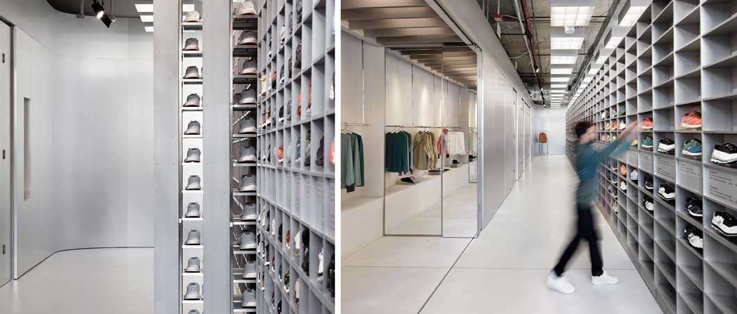 Armários de aço organizam todos os tamanhos de calçados, permitindo acesso imediato a qualquer modelo e otimizando a experiência de compra.