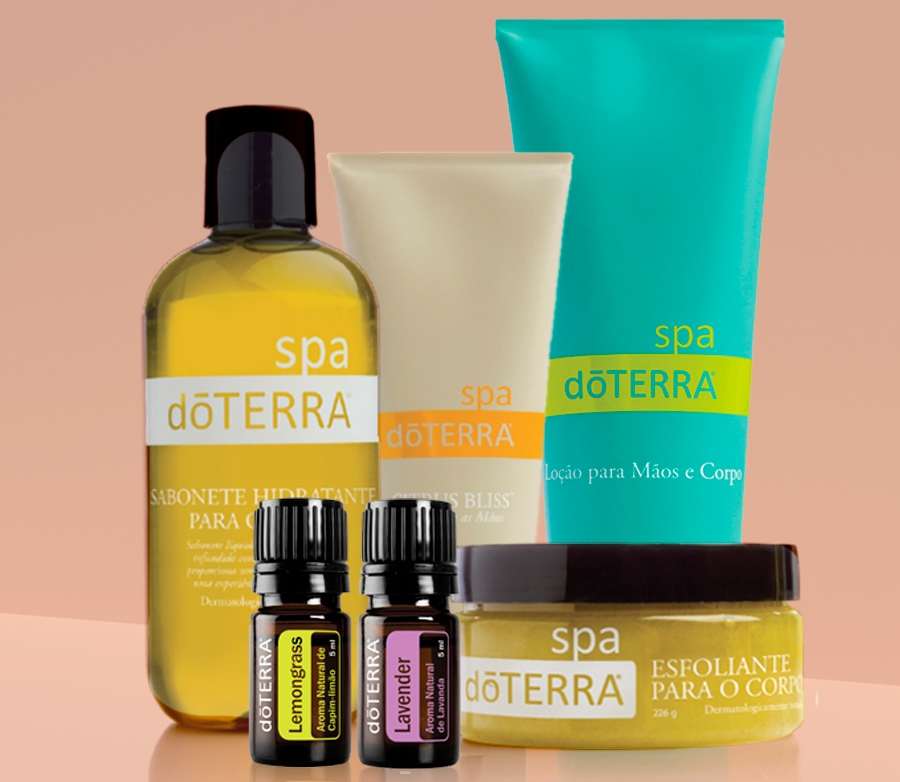 • Esfoliante para o Corpo doTERRASpa: É um produto natural que, com a cana-de-açúcar, ajuda a esfoliar suavemente a pele, deixando-a com um brilho saudável e natural. Infundido com os óleos essenciais de Laranja Selvagem, Toranja e Gengibre, o produto fornece uma experiência personalizada de spa que seduz os sentidos, conforta o corpo e aquece a alma. Formulado com uma rica mistura de óleos de kukui, macadâmia e coco, o Esfoliante remove não apenas as células mortas mas também, repõe a hidratação vital que ajuda a manter a pele macia e suave. Aplique generosamente no corpo molhado massageando suavemente os pés, cotovelos e qualquer outra área que precise ser esfoliada. Enxágue bem. Usar em dias intercalados, conforme a necessidade.