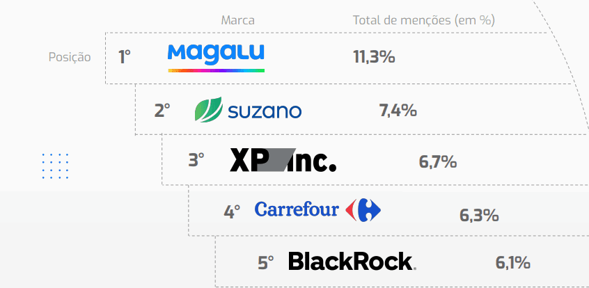 Magazine Luiza, Suzano, XP Investimentos, Carrefour e BlackRock foram as cinco empresas mais citadas quando o assunto é diversidade de equipe, que faz parte do S de ESG. As marcas foram as primeiras de um ranking das 20 marcas mais mencionadas na imprensa brasileira em pautas sobre ações sociais.
