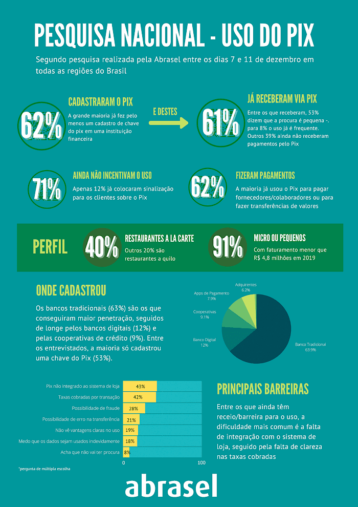 O Pix, sistema de pagamentos instantâneos lançado pelo Banco Central, já foi adotado por 62% dos bares e restaurantes, mostra pesquisa conduzida pela Associação Brasileira de Bares e Restaurantes (Abrasel) em todo o País. E o uso por parte dos clientes está crescendo. Entre os estabelecimentos que cadastraram o Pix, 61% (ou 37% do total) já receberam pagamentos pelo sistema.