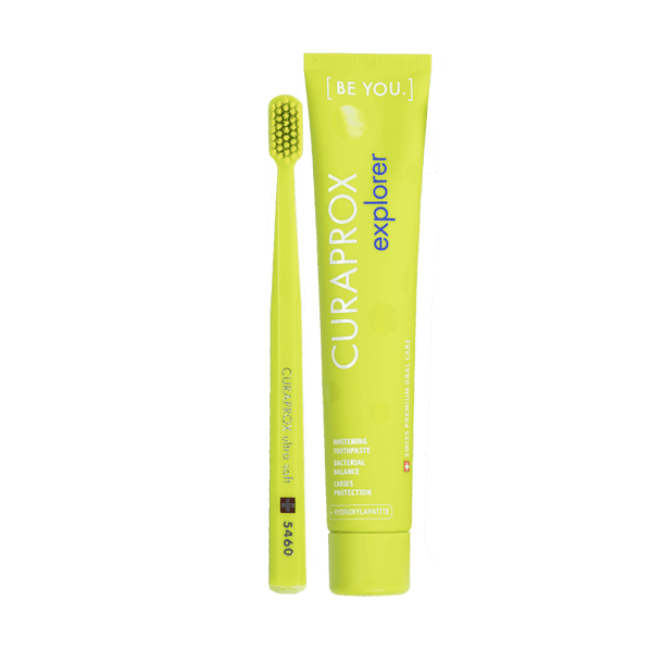 O Creme dental Explorer, da Curaprox, tem sabor de maçã verde e aloe vera, além de trazer menor concentração de produtos químicos potencialmente irritativos; ação antibacteriana é exercida por enzima que ativa proteção natural da saliva.