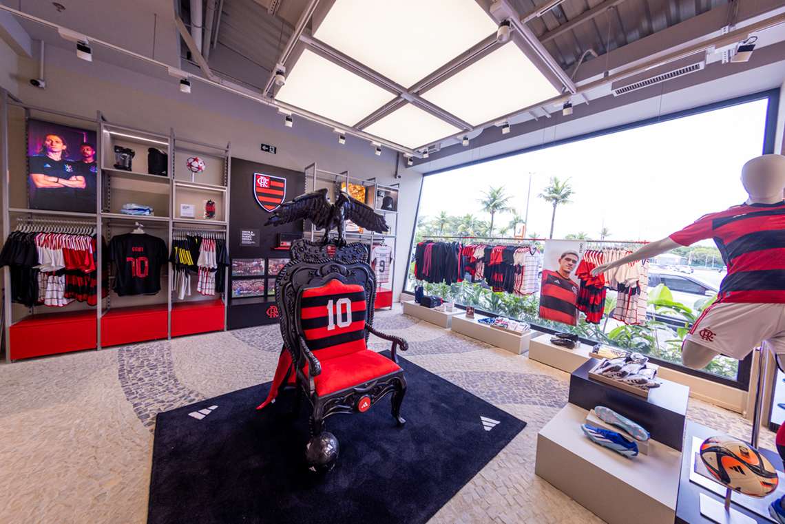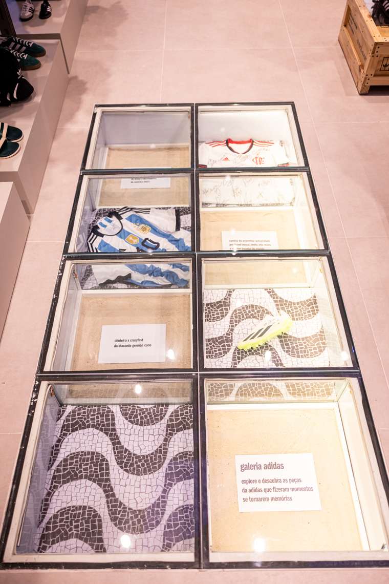Maior loja da Adidas no Rio, o espaço conta ainda com itens raros autografados por nomes parceiros da marca em uma galeria criada no centro da loja. Entre os artigos estão um tênis Superstar utilizado pela cantora Anitta na apresentação do VMA 2023 e uma camisa assinada por todo o elenco do Flamengo em 2022, além de uma camisa da seleção Argentina autografada por Lionel Messi e uma chuteira do atacante Germán Cano.