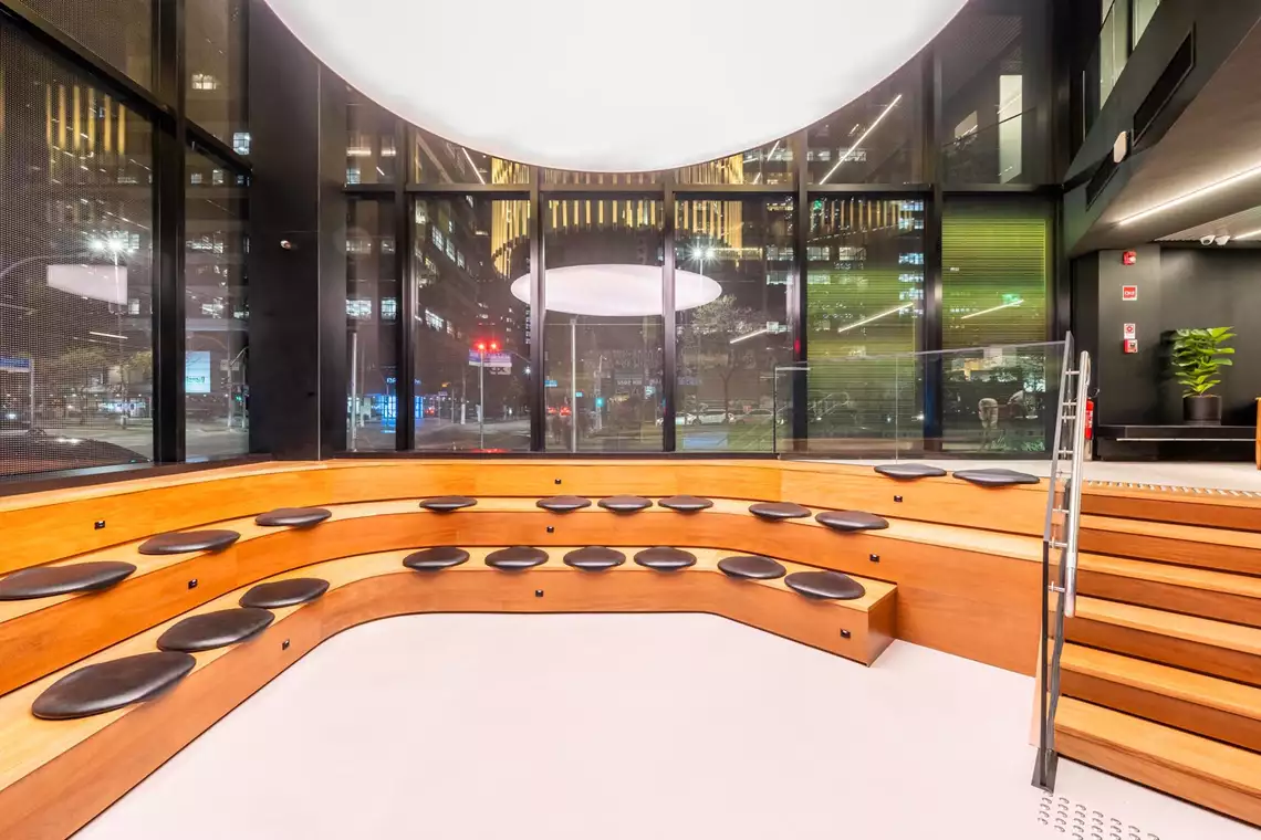 Além disso, o espaço abriga esculturas cinéticas assinadas pelo renomado artista visual Muti Randolph, em parceria com a Unobvious. As obras, dispostas ao redor da cápsula, criam um cenário em multicamadas que pode ser tanto estático quanto dinâmico, o que confere ao edifício um aspecto vivo, artístico e tridimensional.