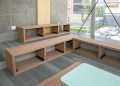As paredes foram feitas de wood frame, que substituem materiais de aço e gesso, um método que evita resíduos de obra e mantém a durabilidade que o ambiente exige. As mesmas premissas de materiais ambientalmente responsáveis foram aplicadas no piso, que é feito com agregados de demolição como matéria-prima, além de revestimentos 100% reciclados nas paredes dos banheiros.