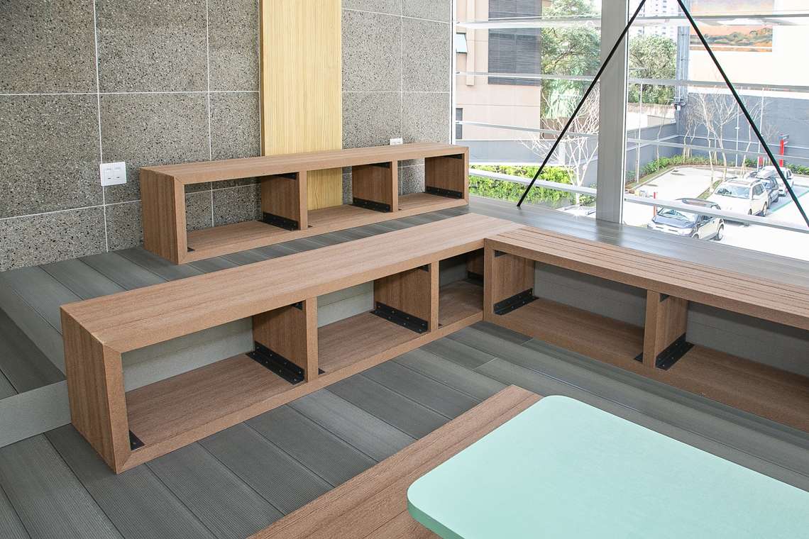 As paredes foram feitas de wood frame, que substituem materiais de aço e gesso, um método que evita resíduos de obra e mantém a durabilidade que o ambiente exige. As mesmas premissas de materiais ambientalmente responsáveis foram aplicadas no piso, que é feito com agregados de demolição como matéria-prima, além de revestimentos 100% reciclados nas paredes dos banheiros.