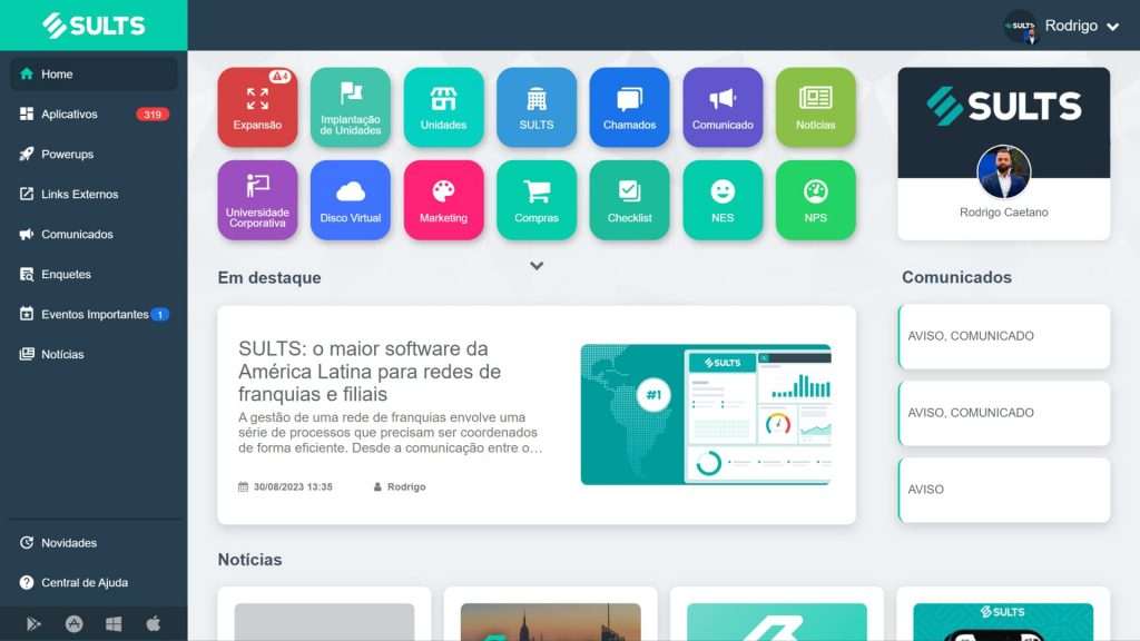 O SULTS tem praticamente todos os recursos necessários para a gestão de uma rede, abrangendo todas as suas etapas. Sendo assim, a ferramenta possui tudo o que você precisa para gerenciar a comunicação, engajar seus colaboradores, garantir a qualidade do seu negócio, aumentar a produtividade e conduzir todas as atividades do dia a dia no ambiente de trabalho. Confira os principais módulos do SULTS: