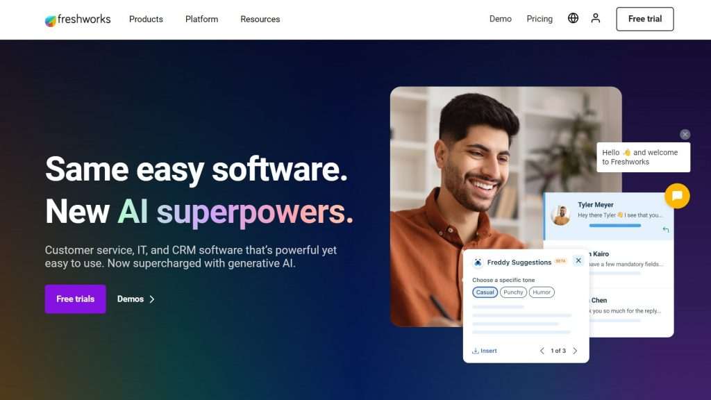 A Freshworks é uma empresa desenvolvedora de soluções SaaS com foco em áreas como: suporte, vendas e marketing. Ela empresa fornece às organizações de todos os tamanhos soluções de envolvimento do cliente SaaS que ajuda os profissionais de suporte, vendas e marketing se comunicarem efetivamente com os clientes para um melhor serviço e colaborarem com os membros da equipe para resolver problemas dos clientes.