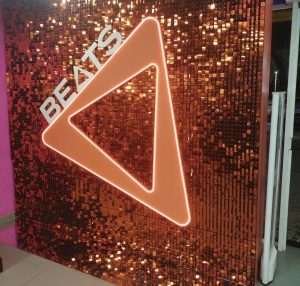 Dentro da loja, um painel brilhante da Beats convida os frequentadores a tirar fotos criativas e a interagir com a marca em postagens pelas redes sociais.