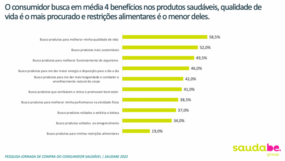 De forma geral, os consumidores buscam, em média, quatro benefícios nos produtos saudáveis: qualidade de vida, sustentabilidade, funcionalidade e, em menor grau, emagrecimento pela estética. Isso demonstra uma mudança no comportamento do consumidor, com uma maior valorização do bem-estar holístico.