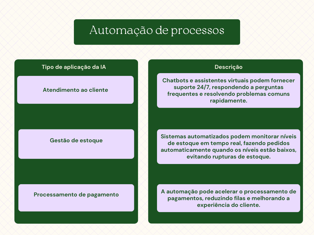 Automação de processos: A automação de processos no varejo, impulsionada pela IA, oferece diversas oportunidades práticas: