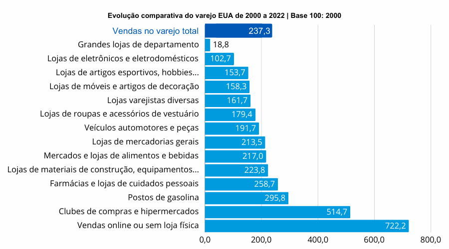 Ao acompanhar o comportamento dos setores, segmentos e canais de varejo nos EUA, avaliando o período de 2000 a 2022, é possível ter uma visão clara da evolução de alguns segmentos e modelos em comparação com outros, refletindo mudanças comportamentais, hábitos, atitudes e o crescimento dos canais não-loja.