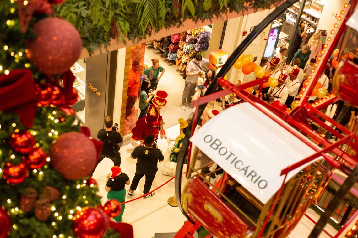 A decoração natalina do shopping deste ano aposta na nostalgia do Natal por meio de cores clássicas e elementos típicos, como o personagem “soldadinho de chumbo” e caixas de presentes.
