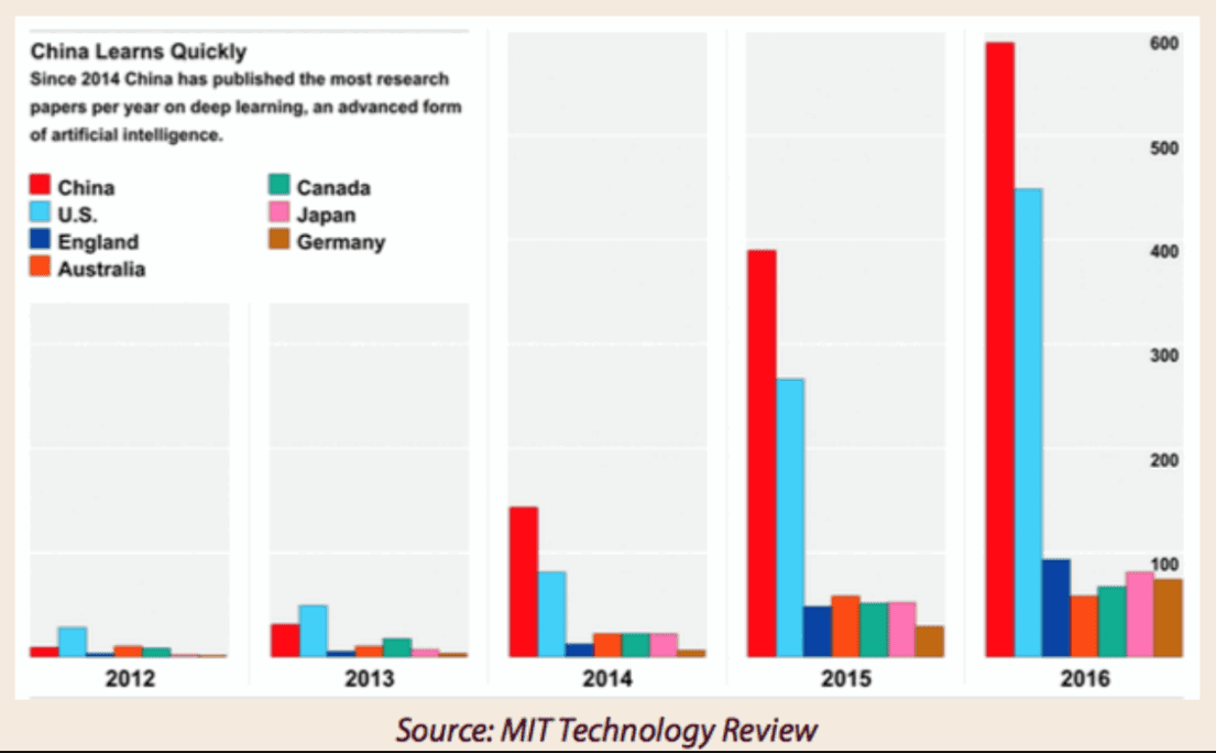 Essa conjuntura faz com que haja na China um ambiente para amplo desenvolvimento nas áreas que ditarão o futuro das dinâmicas comerciais e de poder. Por exemplo, o país investe sistemicamente em inteligência artificial, alocando investimento público e criando incentivos para as empresas privadas fazerem o mesmo.