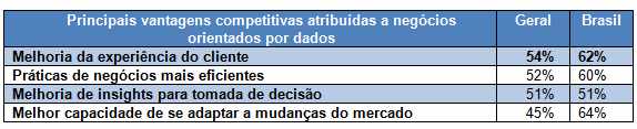A pesquisa da Experian mostra unanimidade das empresas (98%) em relação ao uso da gestão de dados para promover a melhoria da experiência do cliente. A otimização da interação com o consumidor apareceu entre as vantagens competitivas mais atribuídas a uma atuação orientada pela inteligência da informação – tanto na média dos países quanto no indicador das companhias ouvidas no Brasil: