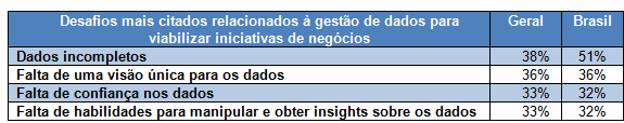 - 1 em cada 3 companhias (33%) considera a confiança como o maior desafio para conseguir extrair valor dos dados gerenciados.