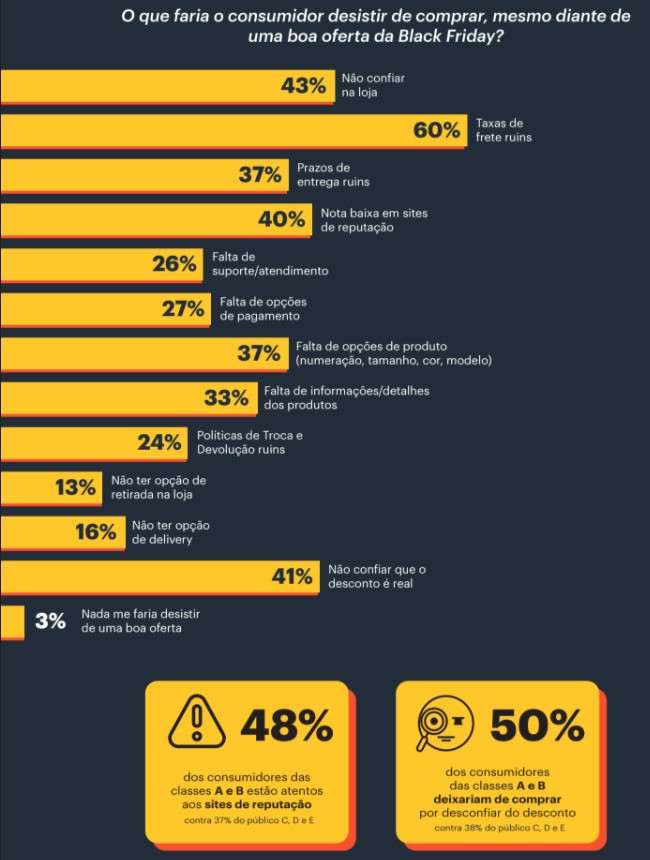 E, ainda falando sobre confiança, a falta dela é um dos pontos que podem fazer com que consumidores engajados desistam da compra – pelo menos foi o que 43% afirmaram em relação às lojas e 41% em relação aos descontos que podem parecer irreais: