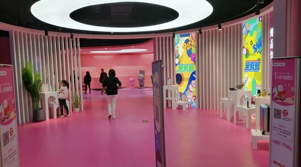 A empresa abriu um shopping center de 20 mil m² em Nanjing (na província de Jiangsu) que combina transmissões ao vivo e compras nas lojas, mostra reportagem do Global Retail News. Inaugurado em setembro, o empreendimento inclui um supermercado com cerca de 4 mil m². Também existe um espaço para o Carrefour (propriedade da Suning.com na China) e um estúdio de televisão ao vivo. O modelo é inédito na China, um país de inovação no varejo.