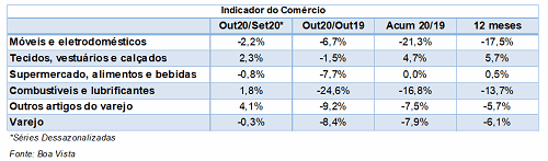O Indicador Movimento do Comércio, que acompanha o desempenho das vendas no varejo em todo o Brasil, recuou 0,3% em outubro na comparação mensal dessazonalizada, de acordo com dados apurados pela Boa Vista. Na avaliação acumulada em 12 meses, o indicador apresenta retração de 6,1%. No acumulado do ano, a queda é de 7,9% contra o mesmo período do ano passado. Já em relação ao mesmo mês de 2019, o varejo caiu 8,4%.